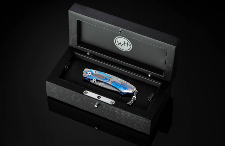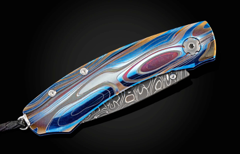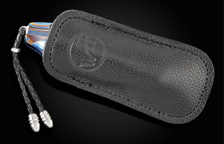 The Kestrel 'Galassia' features a light and resilient titanium frame, anodized blue and laser engraved. The blade is hand-forged 'Intrepid' damascus by Chad Nichols; the one-hand button lock and thumb stud are set with white topaz gemstones. The Kestrel is a compact but versatile folder that works and presents beautifully in any situation; the design, which offers a deep finger groove at the intersection between the handle and blade, makes this knife remarkably comfortable in the hand while being very small and easy to carry. The ‘Galassia’ is an elegant and distinctive personality statement to be worn and used for a lifetime.