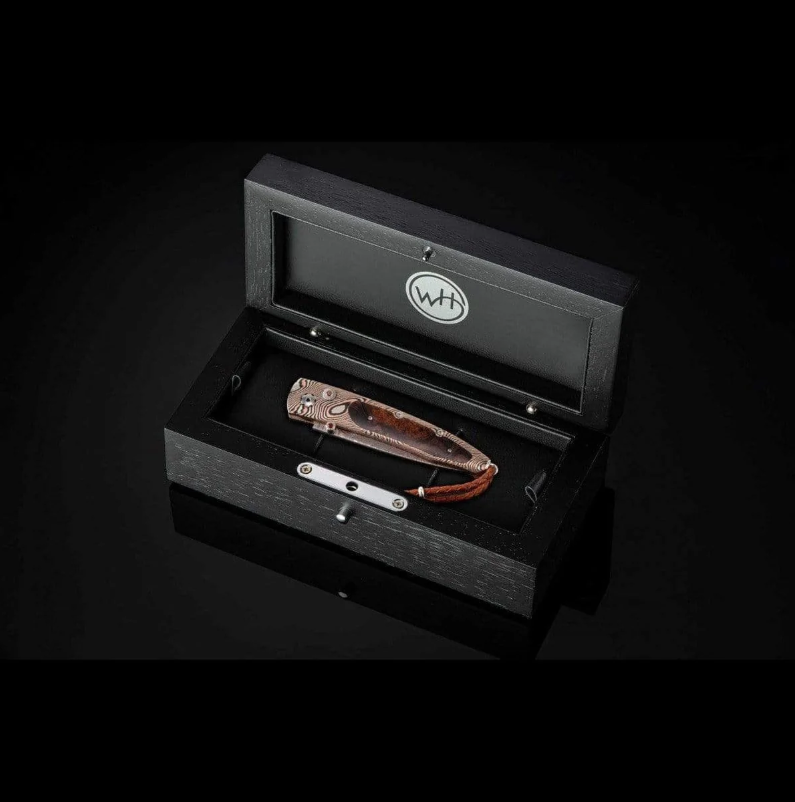 The Lancet 'Acoma' features a beautiful frame in 'Twist' Mokume Gane by Mike Sakmar, inlaid with desert ironwood. The blade is 'Copper Wave' damascus with an extra-strong core in VG-10; the one-hand button lock and the thumb stud are set with citrines.