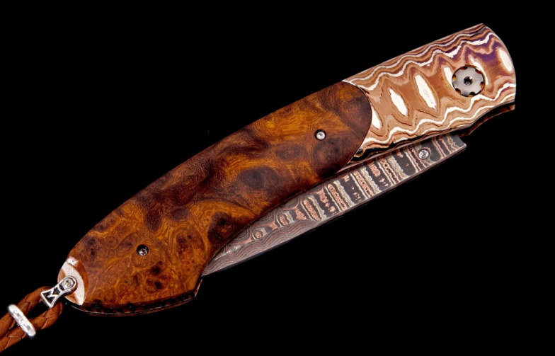 The Spearpoint 'Rustic' features a beautiful frame in William Henry's signature (and patent pending) 'Wave' Mokume, inlaid with a stunning scale in desert ironwood. The blade is 'copper wave' damascus steel with an extra sharp core in VG-5 steel. The one-hand button lock and the thumb stud are set with citrine gems. A remarkable design that gives you an instrument with a full-size secure grip, and a versatile deep-belly blade, the Spearpoint epitomizes William Henry’s core philosophy – that superlative function deserves to be elevated to superlative art. The 'Rustic' also features 2 of William Henry's most admired and distinctive forged metals; a timeless heirloom to be proudly worn and used for a lifetime before being handed-down to another generation.