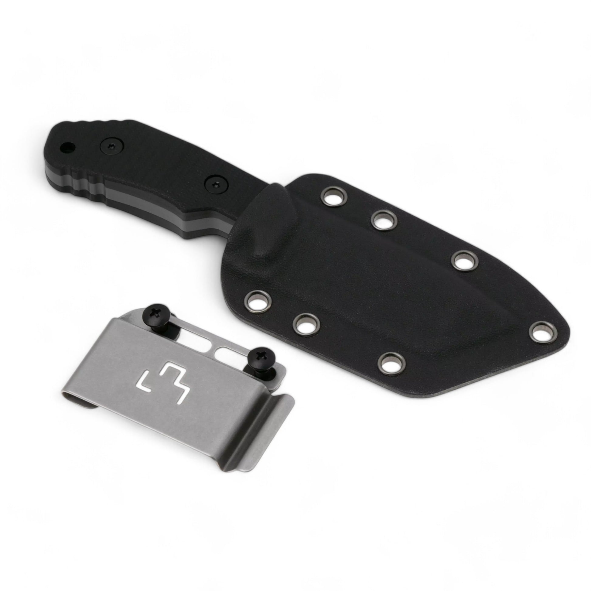 The fixed knife convinces with its compact size and a bulky Tanto blade made of D2, which is coated with a dark grey titanium coating and a pronounced hollow groove. The jimpings on the back of the blade promises a safe thumb rest for difficult cutting work. Despite the wrath of the gods, the well-shaped and partially serrated G10 handle always lies securely in the hand. Using a standard 3D printer, you can easily print out alternative handle scales in a wide variety of shapes, colours and materials yourself. Includes lanyard hole, belt clip and high-quality Kydex sheath